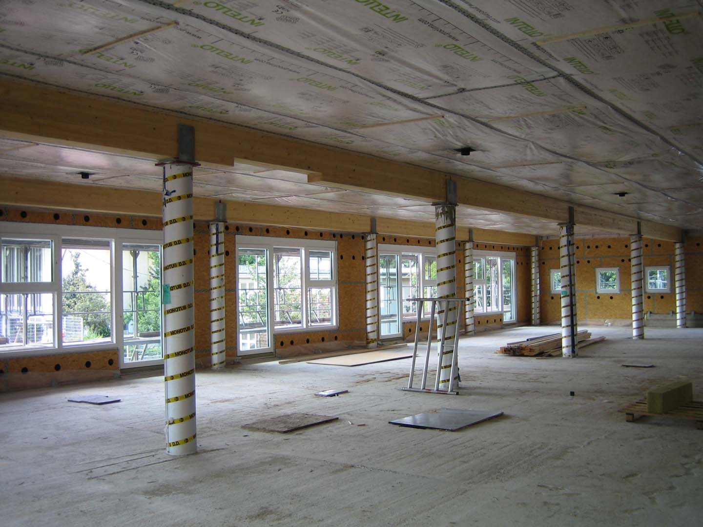 Tragende Konstruktion Stahlbeton, Außenhülle Holzständerwände mit Cellulosedämmung